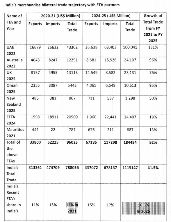 The results are clear: between FY 2020–21 and FY 2024–25, India’s merchandise trade with strategic FTA partners grew by 92%, compared with 41.5% growth in India’s total merchandise trade with the world.